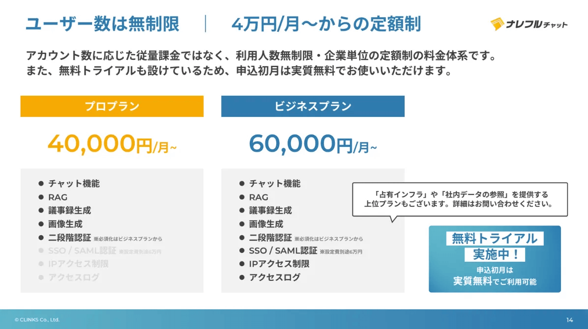 ナレフルチャットは企業単位で月額4万円かつ、従業員数が増えても追加費用は発生しません。