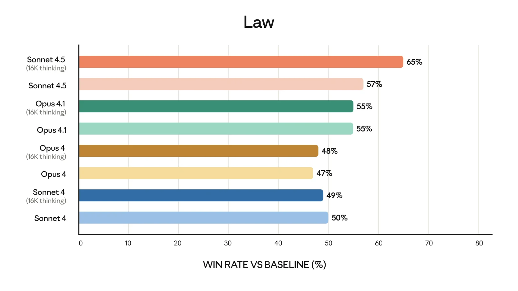 各分野の専門家による評価では、Claude Sonnet 4.5は前モデルのOpus 4.1と比較しても、より優れたドメイン知識と推論能力を示しています。
