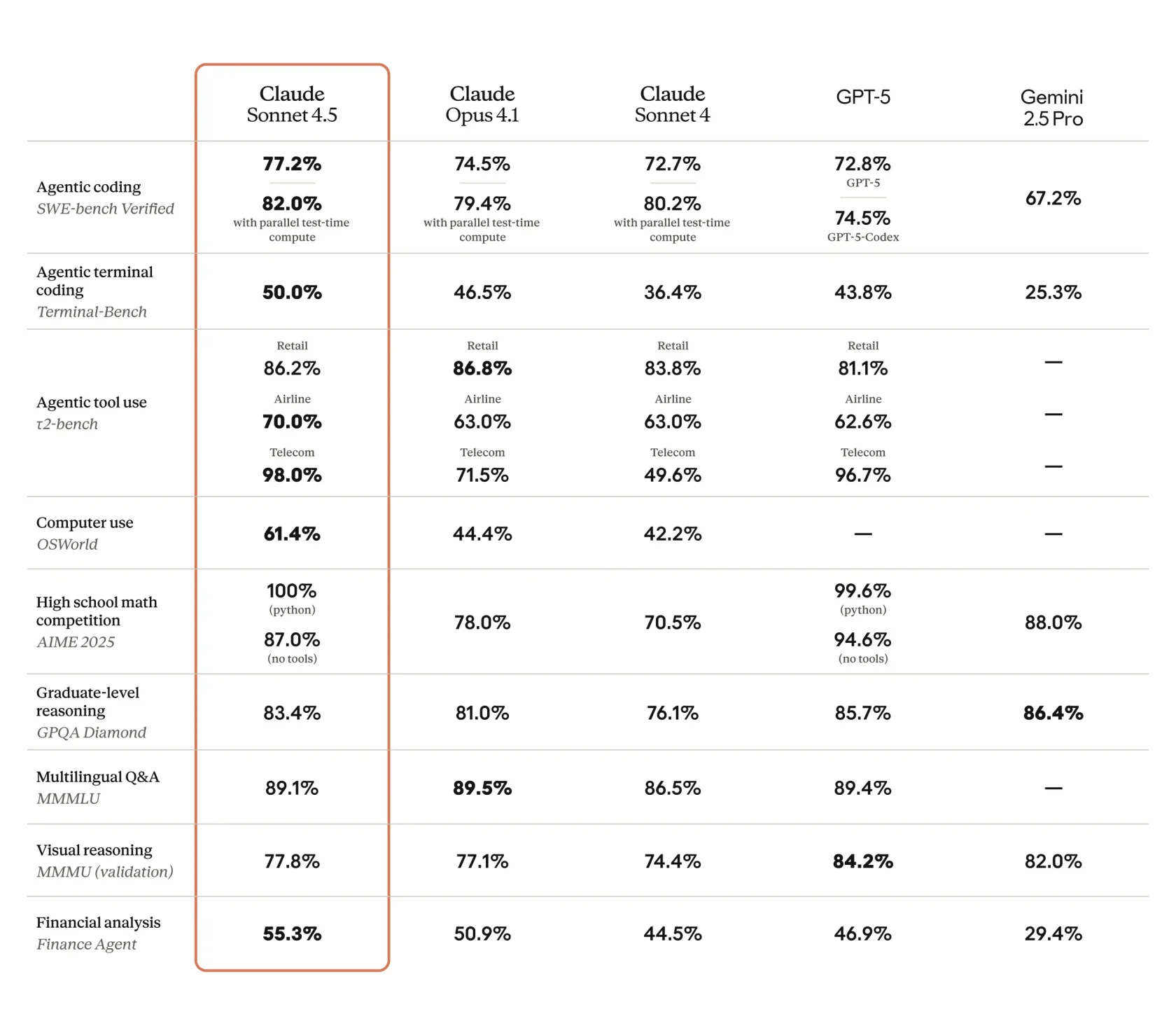Claude Sonnet 4.5は、コーディング以外のベンチマークでも優れた成績を収めています。