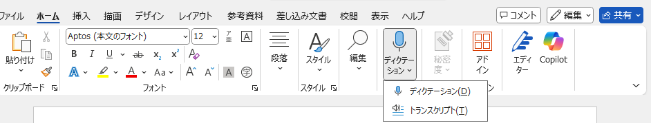 - Wordを開いて「ホーム」タブから「ディクテーション」の下にある矢印をクリック