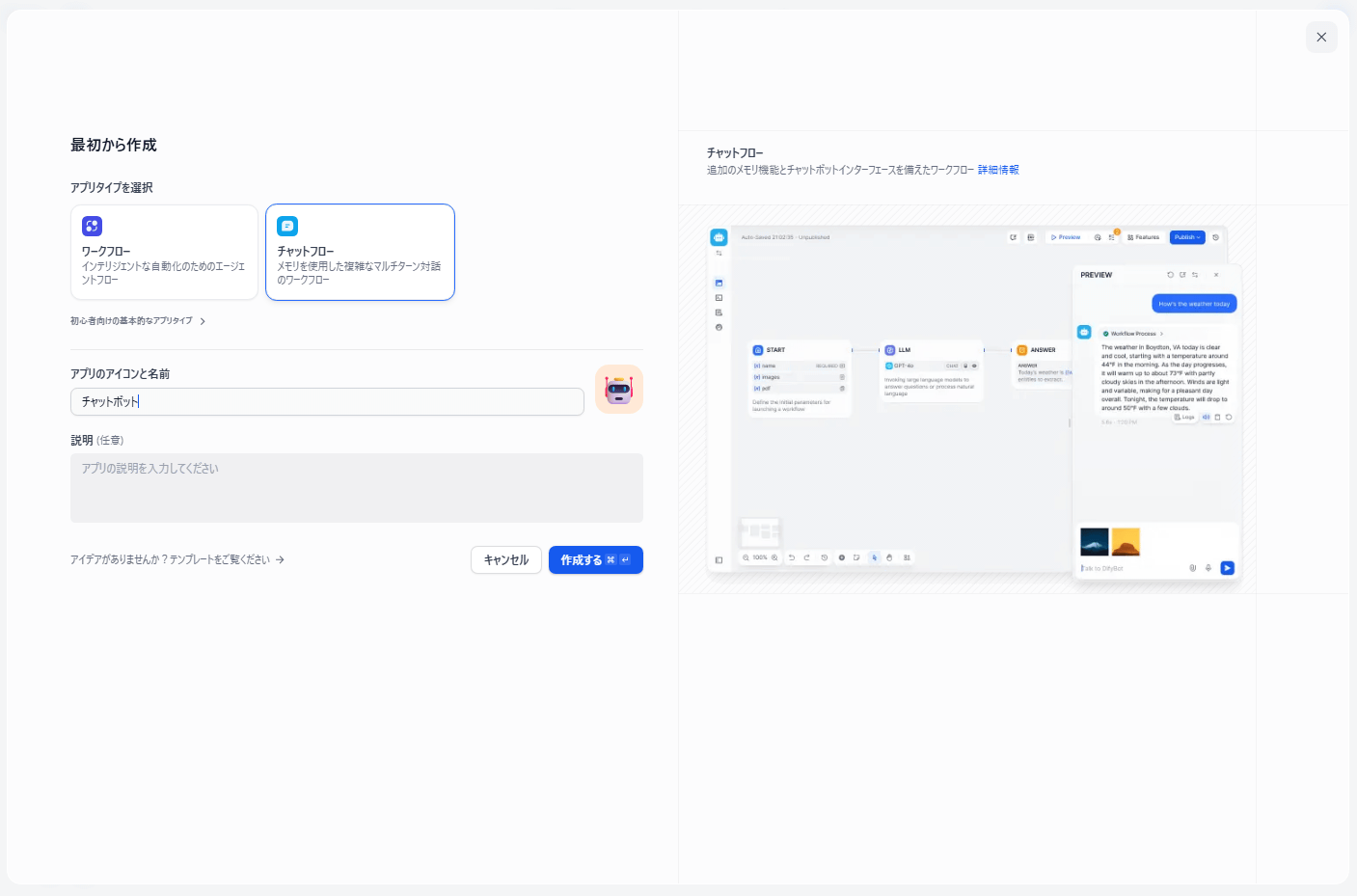 Difyの最大の特徴は、プログラミング不要でAIアプリを構築できるという点です。ドラッグ&ドロップの操作だけで、高度なAIチャットボットやワークフローを作成できます。