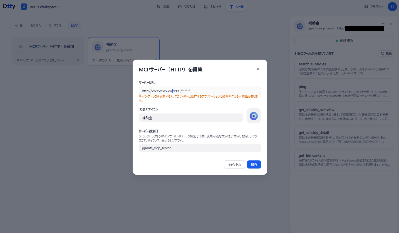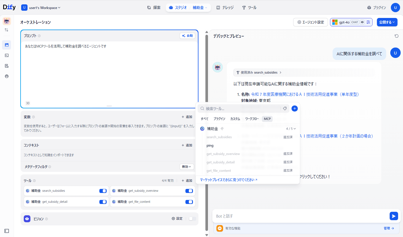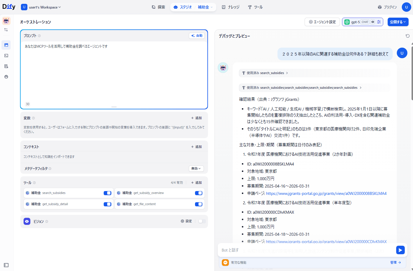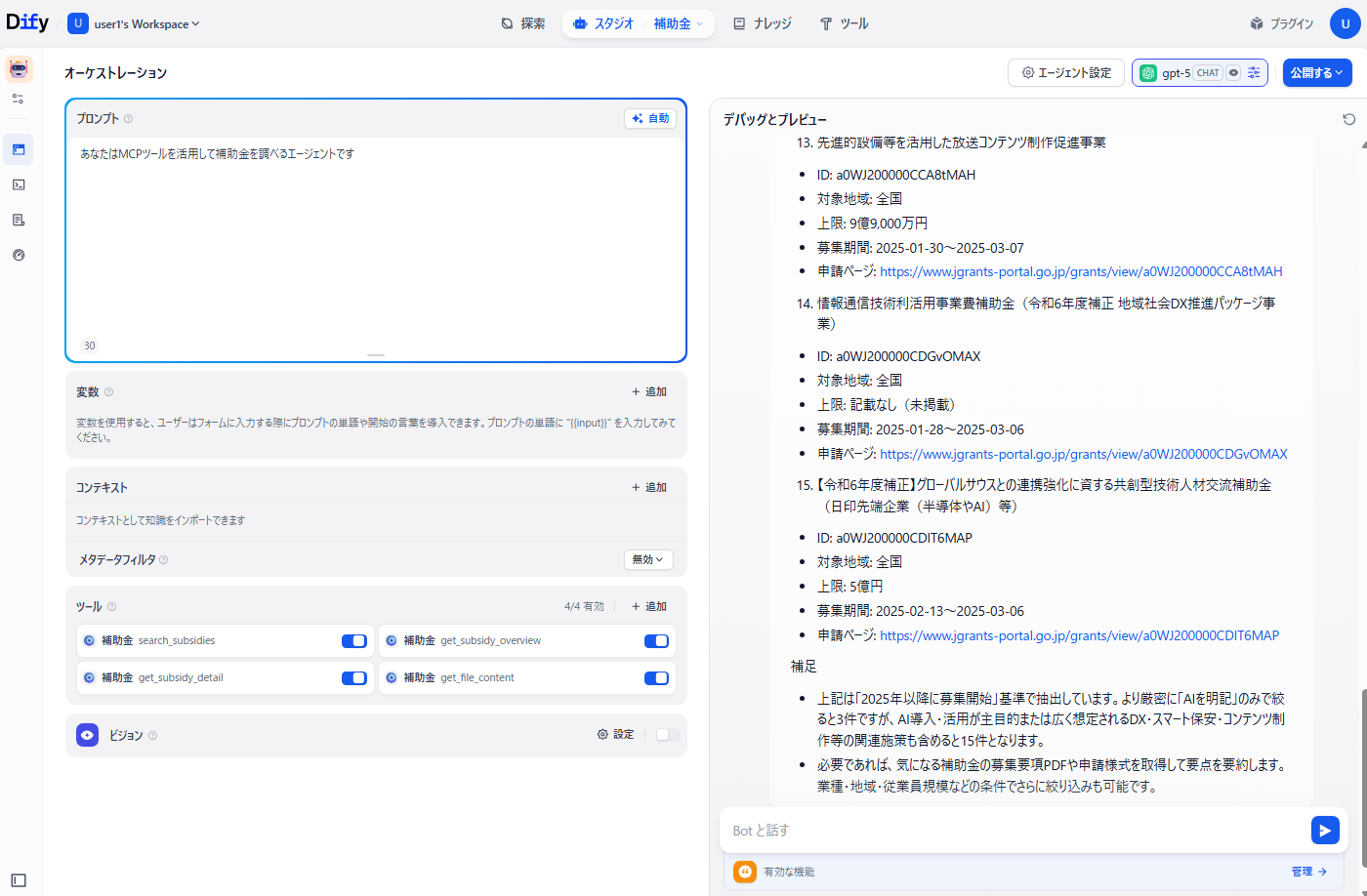 3. 利用可能なツール(補助金検索関数など)が表示されることを確認