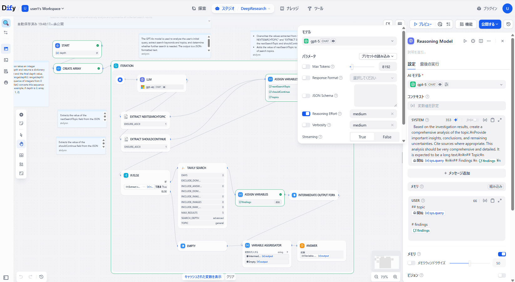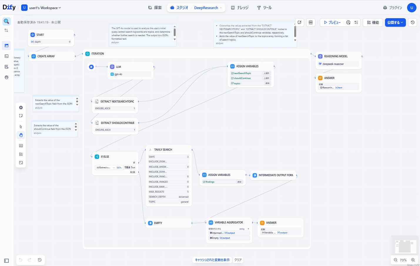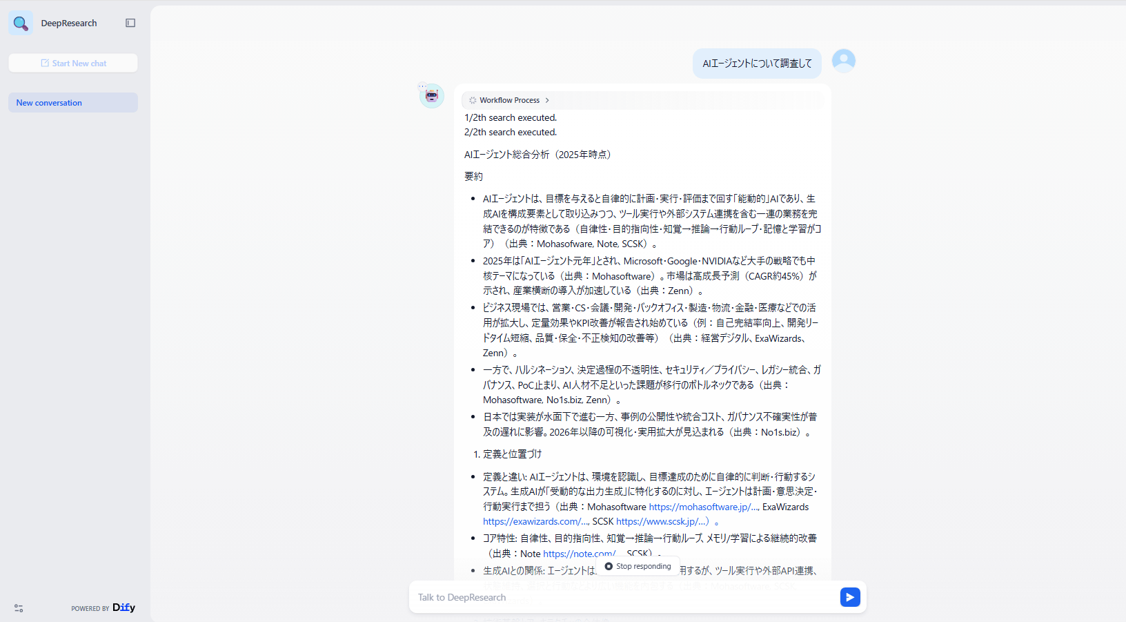 ディープリサーチワークフローは、複数のWeb検索を組み合わせて、包括的な調査レポートを自動生成する機能です。