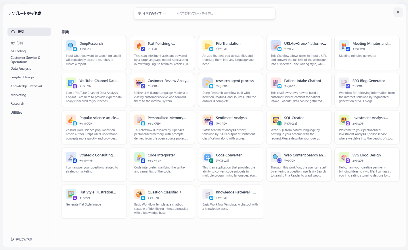 Difyには、すぐに使えるテンプレートが多数用意されています。
