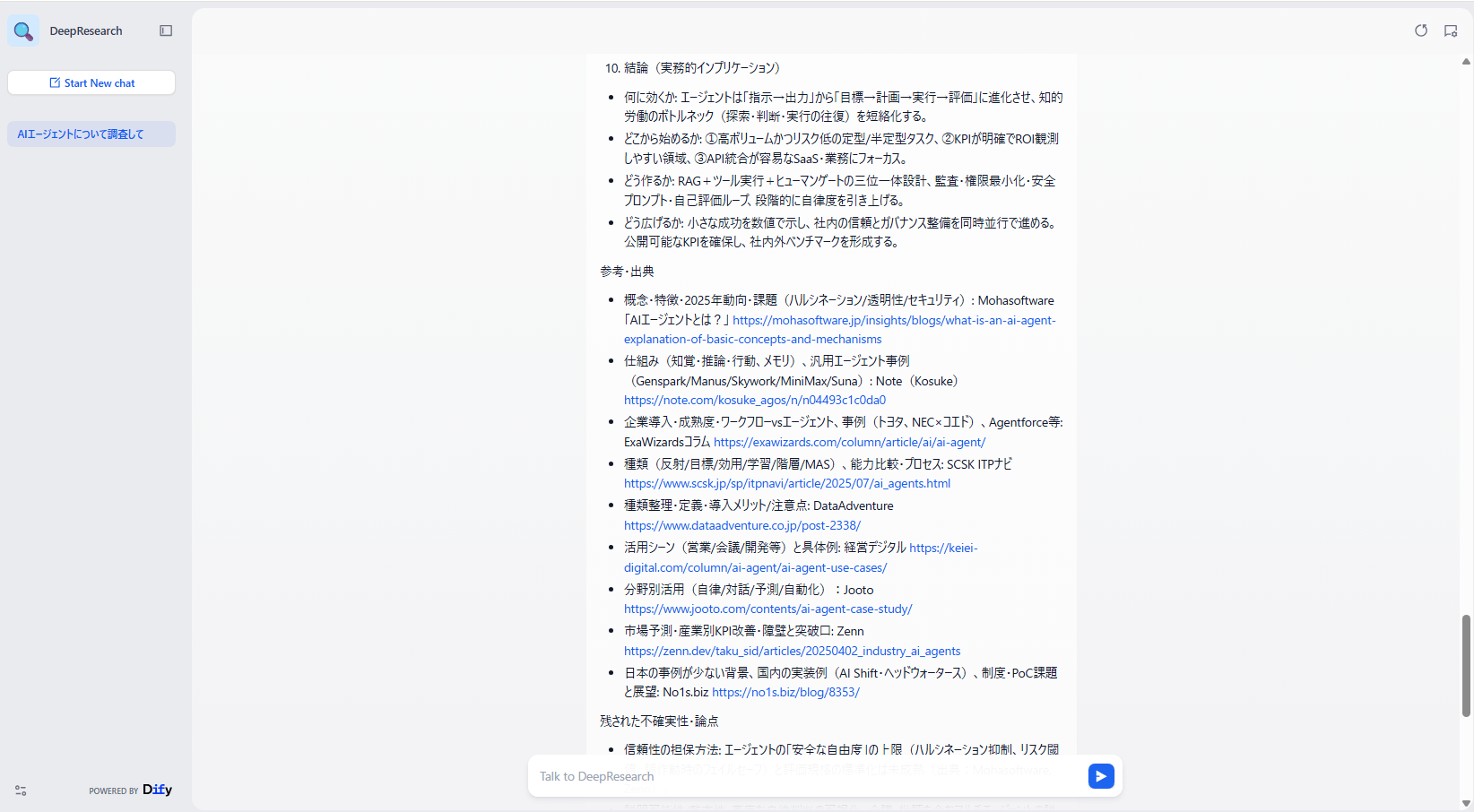 ディープリサーチワークフローは競合分析や市場調査に非常に役立ちました。人間が手作業で行うと数時間かかる調査を、AIが数分で完了してくれるのは本当に便利です🐰