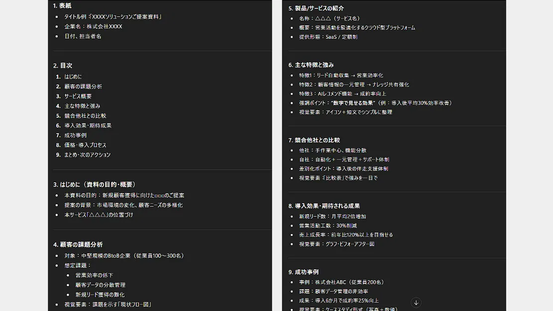 提案資料や企画書の構成を考える際も、ChatGPTの活用が有効です。ChatGPTを活用することで、顧客の課題を整理し、論理的な提案の流れの骨子を作成できます。