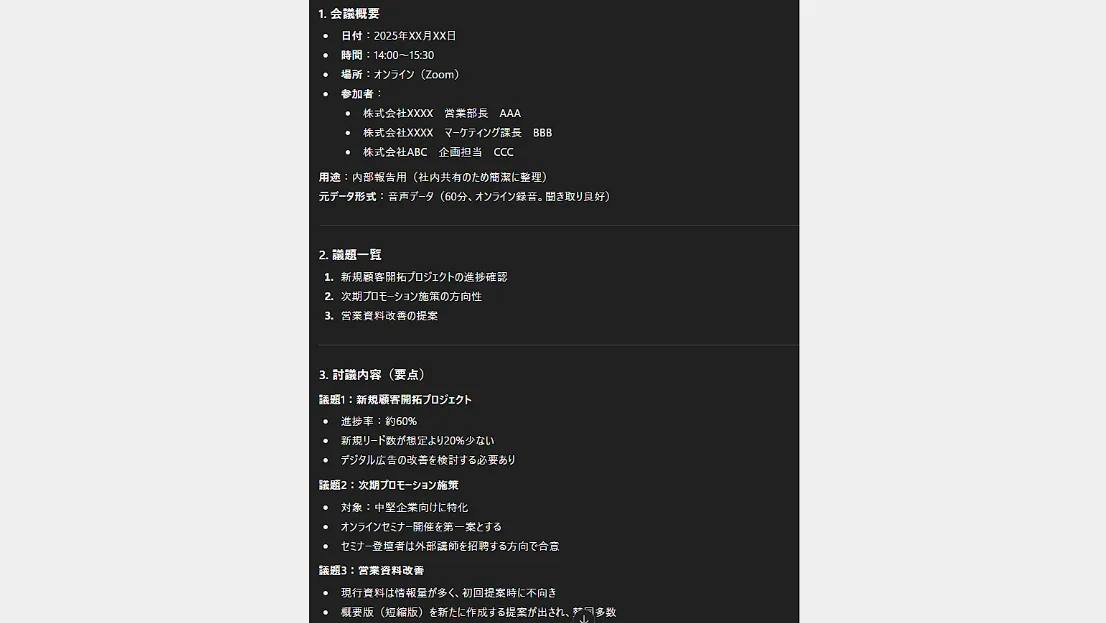 商談や打合せ後の議事録作成は時間がかかる作業ですが、ChatGPTを使えば効率的に整理できます。
