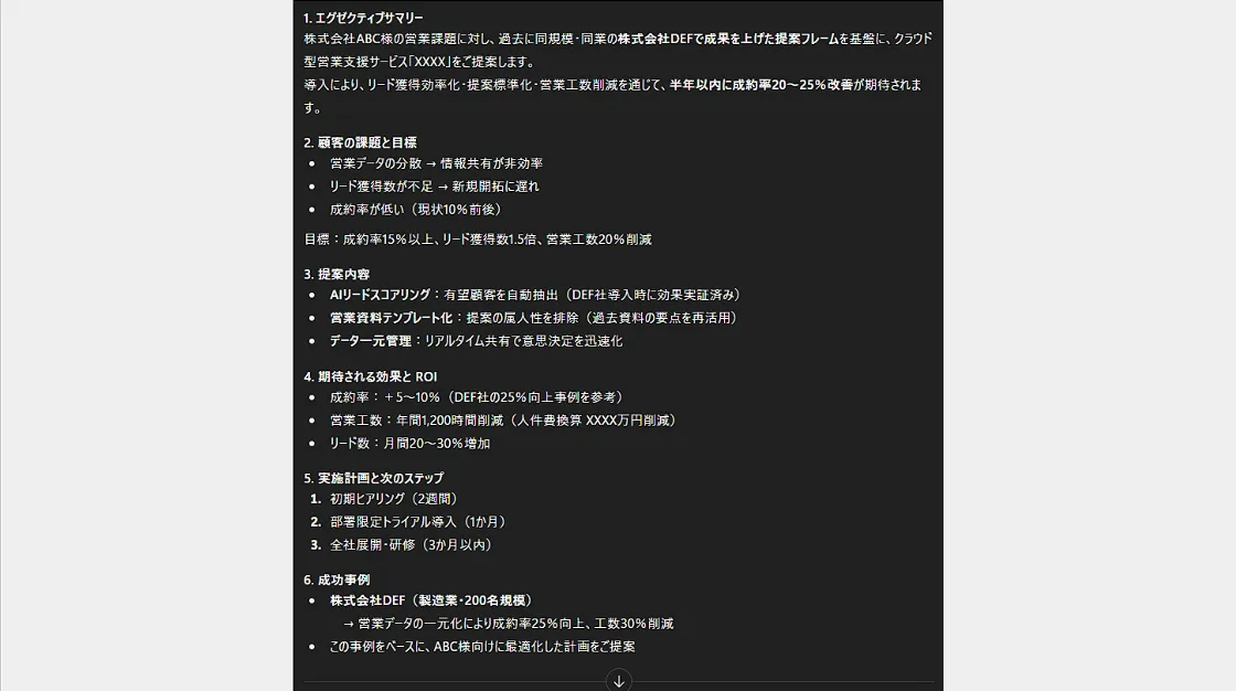 このプロンプトの活用で、論理構成がしっかりした営業資料の骨子を素早く作れます。また、あらかじめわかる内容をしっかりとプロンプトに入れ込むことで、後の修正工数が大幅に削減されるでしょう。
