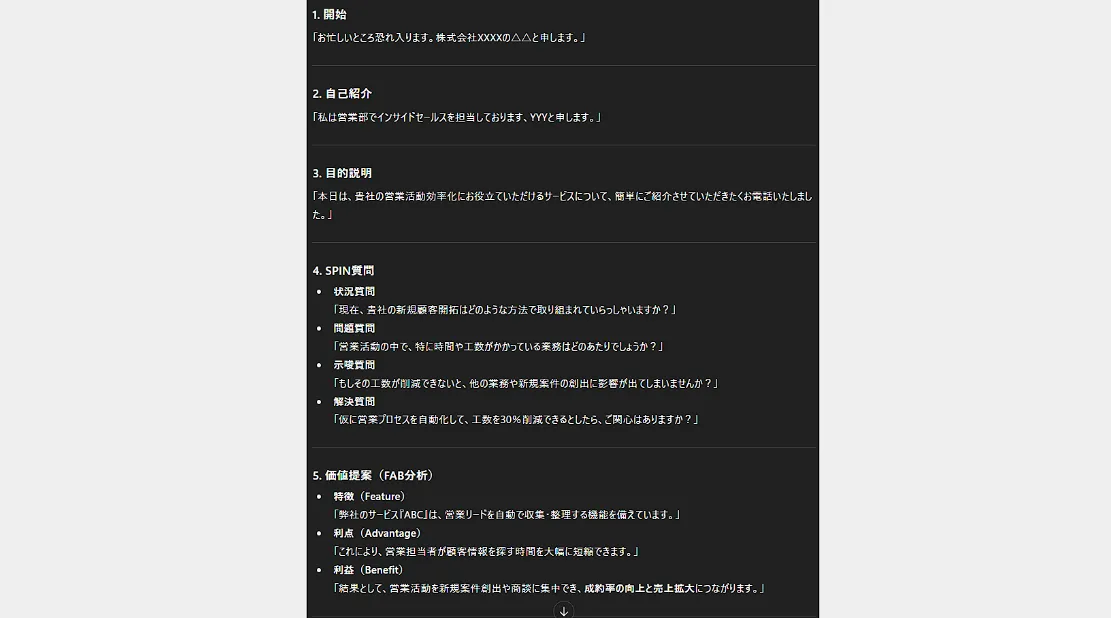 トークスクリプトの作成や営業ロールプレイング、架電・商談へのフィードバックにもChatGPTは活躍します。経験豊富な営業担当者のノウハウをプロンプトやフィードバック項目に落とし込むことで、チーム全体のスキル底上げを図れます。