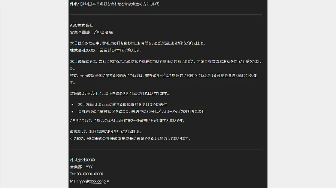 顧客とのコミュニケーションで頻繁に使用するメール作成は、ChatGPTの得意分野です。商談後のお礼メールやフォローアップメール、新規アプローチメールなど、様々な場面で活用できます。