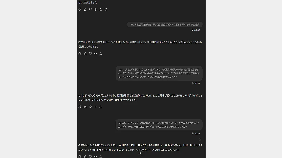 また、音声会話機能を用いれば、ロールプレイング相手にもなります。これにより、新人営業担当者の練習の場として活用でき、実際の顧客対応前にスキルアップを図ることが可能になるでしょう。