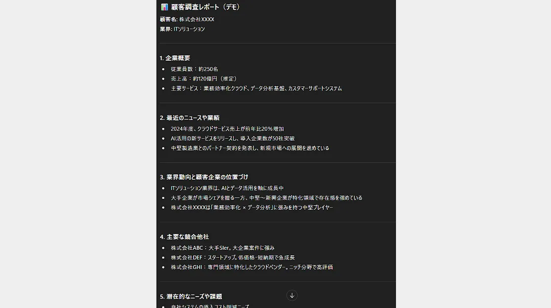 ChatGPTは、顧客の業界情報や企業背景の調査、過去の商談内容を踏まえた提案作成でも活用できます。顧客の過去の行動パターンや発言を分析し、一人ひとりに合わせた対応ができるようになるのです。