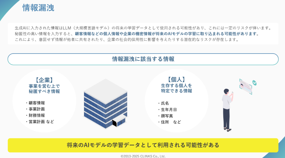 営業活動では顧客情報や機密情報を扱うことが多いため、情報セキュリティは非常に重要です。ChatGPTに入力した顧客情報・個人情報や自社の機密情報などは、AIモデルに学習されてしまうことがあるため、その結果第三者に漏えいしてしまうリスクがあります。