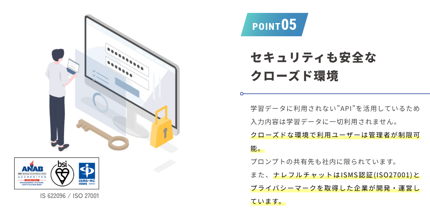 ナレフルチャットでは、営業で活用するにあたって最も重要な、情報セキュリティについても万全の体制を整えています。入力内容を学習データに利用されないAPI方式を採用している上に、ISMS認証(ISO27001)とプライバシーマークを取得した企業が開発・運営しているため安心です。