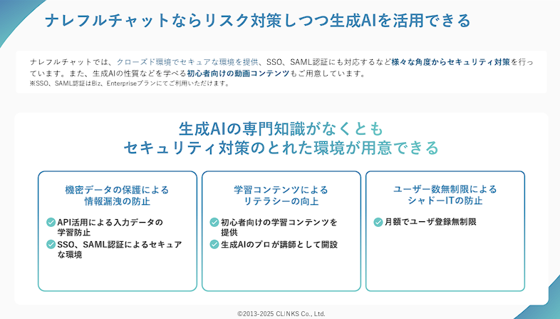 安全にChatGPTなどの生成AIを活用したい企業には、クローズド環境でセキュアな環境を実現するナレフルチャットがおすすめです。