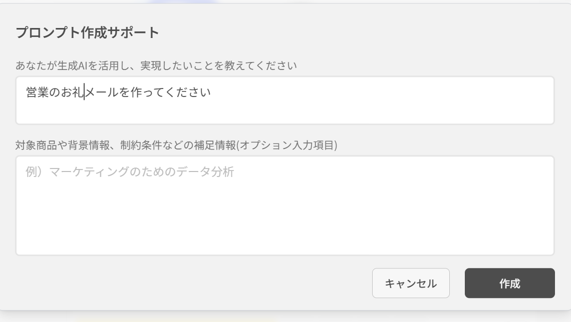 2024年12月にナレフルチャットを導入した最大の理由は、プロンプト作成サポート機能の魅力でした。生成AIのアウトプット品質を左右するプロンプト作成は難易度が高く、社内全員が質の高いプロンプトを書けるわけではありません。