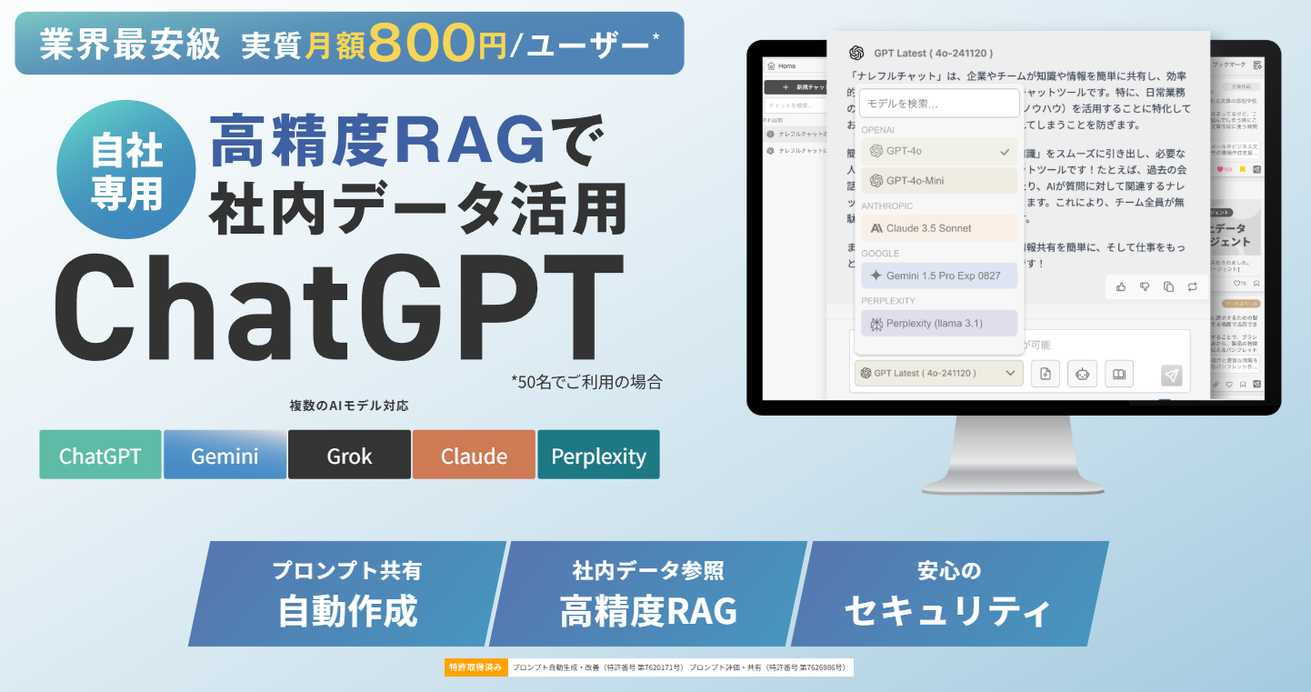 ナレフルチャットは、ChatGPTをはじめとした複数の生成AIモデルを安全な企業環境で活用できるチャットツールです。特許取得済みのプロンプト自動生成機能や、社内データを活用できるRAG機能など、営業現場に特化した機能を備えています。