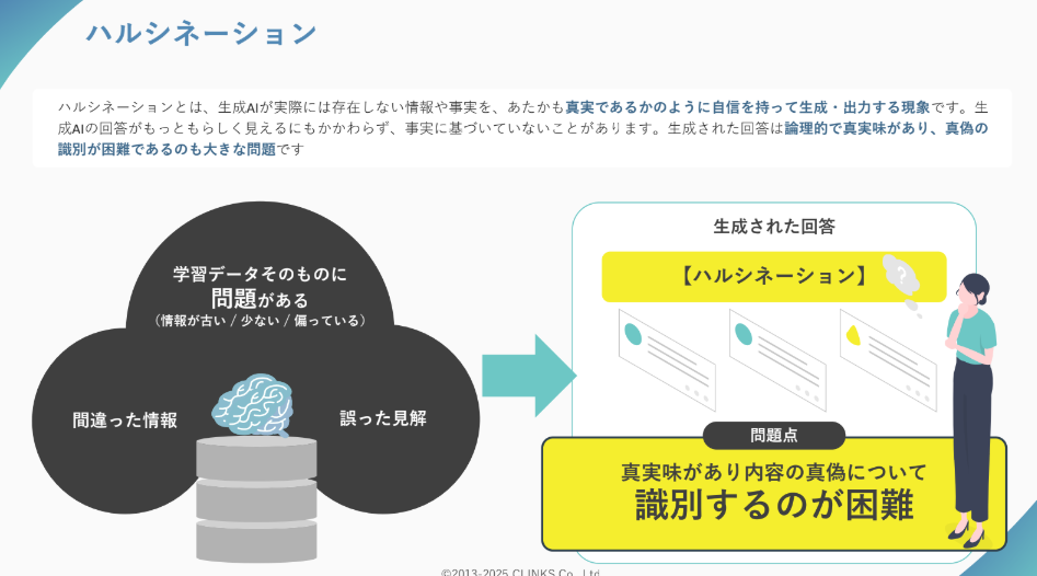 また、質問や指示の内容によっては、誤った情報が出力されることがあります。これはハルシネーションと呼ばれる現象で、生成AIが実際には存在しない情報や事実を、あたかも真実であるかのように自信を持って生成・出力してしまうのです。