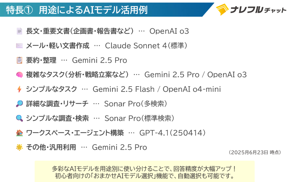ナレフルチャットではChatGPT、Claude、Gemini、Grok、Perplexityなど最新の生成AIモデルが利用可能で、用途に応じて最適なモデルを自動選択してくれます。商談準備にはPerplexity、企業調査にはChatGPT、文書作成にはClaude等、効率的な使い分けができるのです。